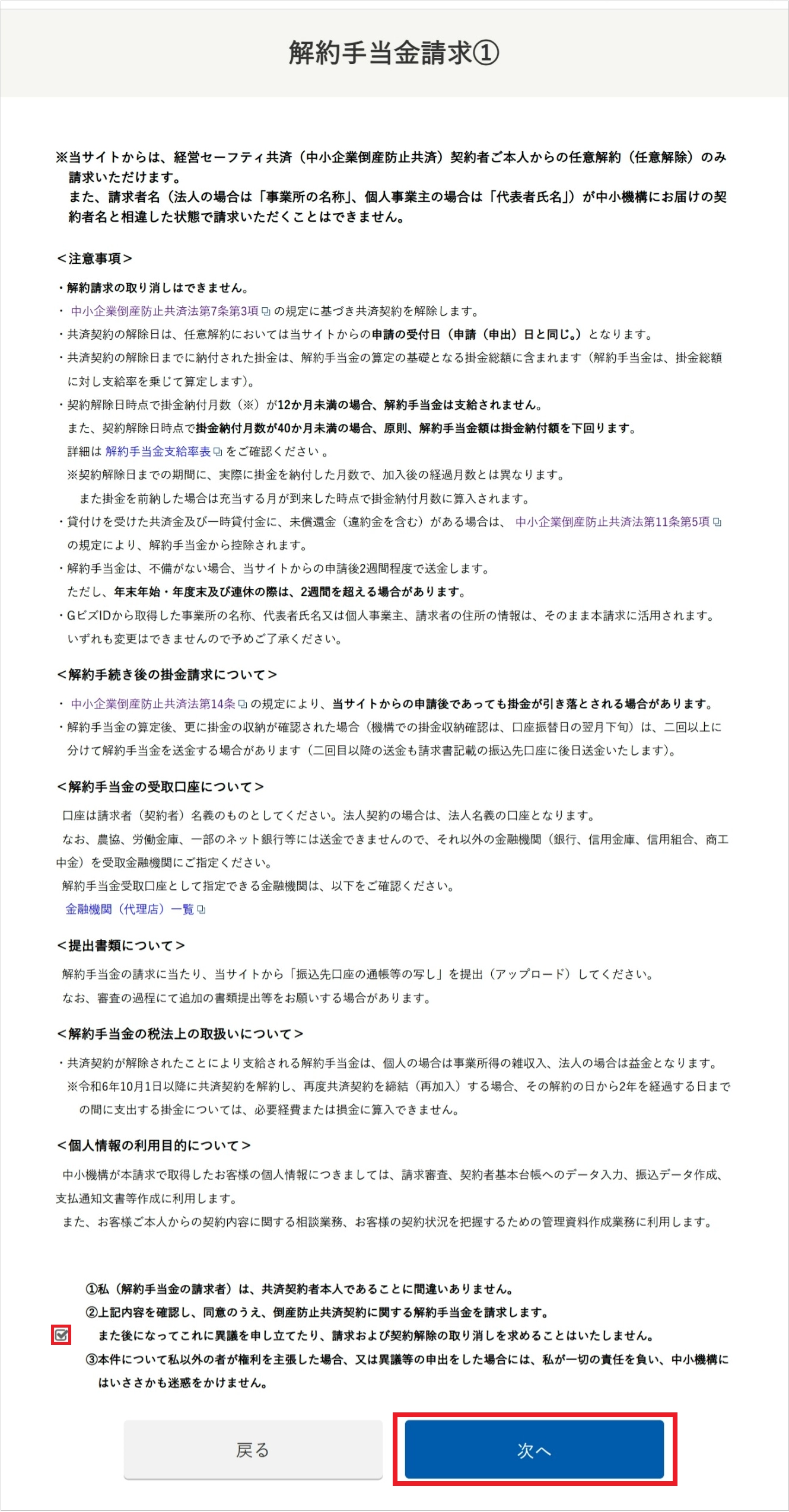- 表示された個人事業主氏名が現在の氏名と相違する場合や、中小機構にお届けの内容と相違する場合はオンラインによる申請はできません。書類での解約手当金請求を行うか、または氏名変更の手続きを書類で行ったのちにオンラインで解約手当金の申請をご利用ください。氏名変更の手続きについては婚姻等により個人事業主の姓名が変わったをご参照ください。