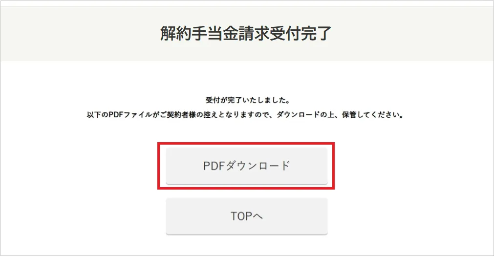 申込が完了すると[解約手当金請求受付完了]画面に遷移し、[PDFダウンロード]ボタンが表示されます。